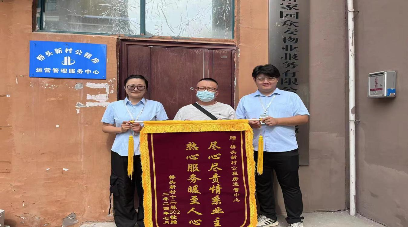 近日,保障房、物業公司管理運營的橋頭新村公租房租戶黃先生將一面寫有“熱心服務暖至人心,盡心盡責情系業主”的錦旗,送到公租房運營管理服務中心,對工作人員提供優質服務、快速解決租戶困難表示肯定和感謝。