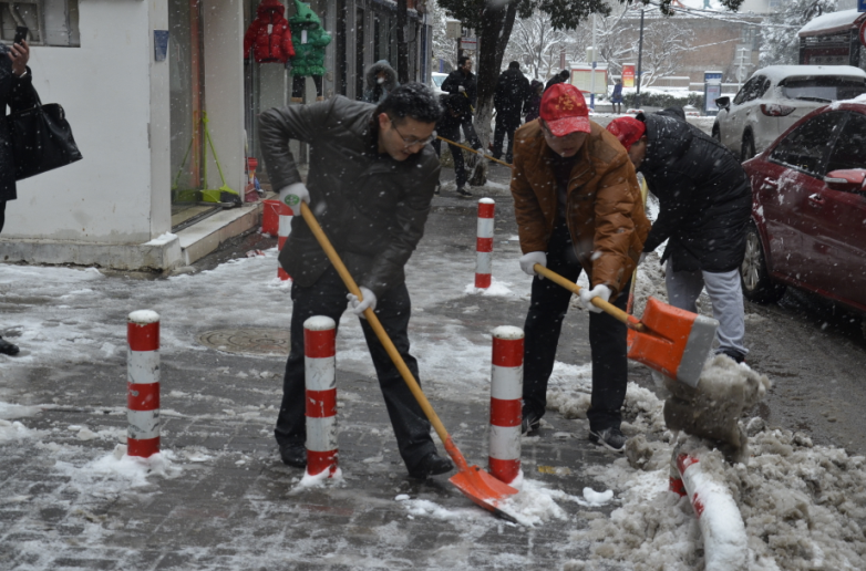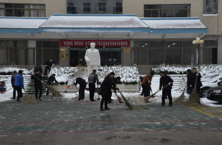 在紀(jì)委書記王獻忠、總經(jīng)理助理朱濤的帶領(lǐng)下,廣大干部職工紛紛拿起鐵鍬、掃帚等工具,不畏嚴(yán)寒,你鏟我掃,相互配合,一點點地將積雪和冰層鏟起清除。盡管大家的臉都凍得通紅通紅,但手中的掃雪工具卻不停地?fù)]舞著,忙得渾身是汗,在歡聲笑語中掃出了暢通的大道,受到過往市民的紛紛稱贊。