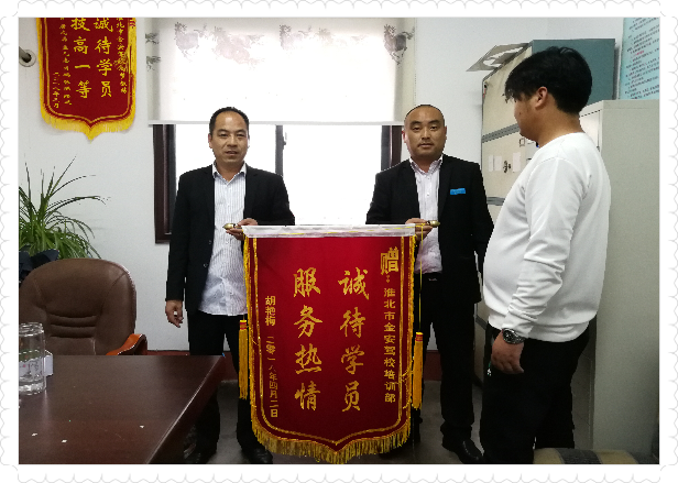 2018年4月2日,淮北市金安駕校學員胡艷梅來到金安駕校培訓部,將一面繡有“服務熱情、誠待學員”字樣的錦旗送到培訓部的工作人員手里,對培訓部的所有工作人員表示感謝。